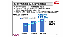 コックスの2020年2月期におけるEC売上高は、前期比15.8%増の16億9700万円。連結売上高に占めるECの割合(EC化率)は約10%。