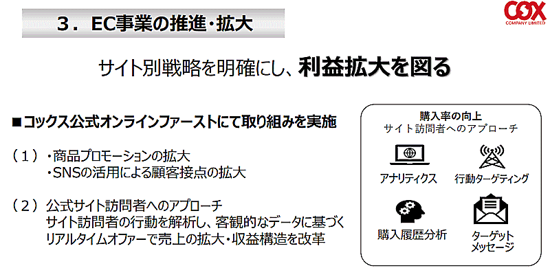 「コックス公式オンラインストアのリニューアル」は、「スマホファースト」のECサイトへ刷新するほか、自社ECサイトとモール店といったサイト別戦略を明確にし、利益拡大を図っていく。