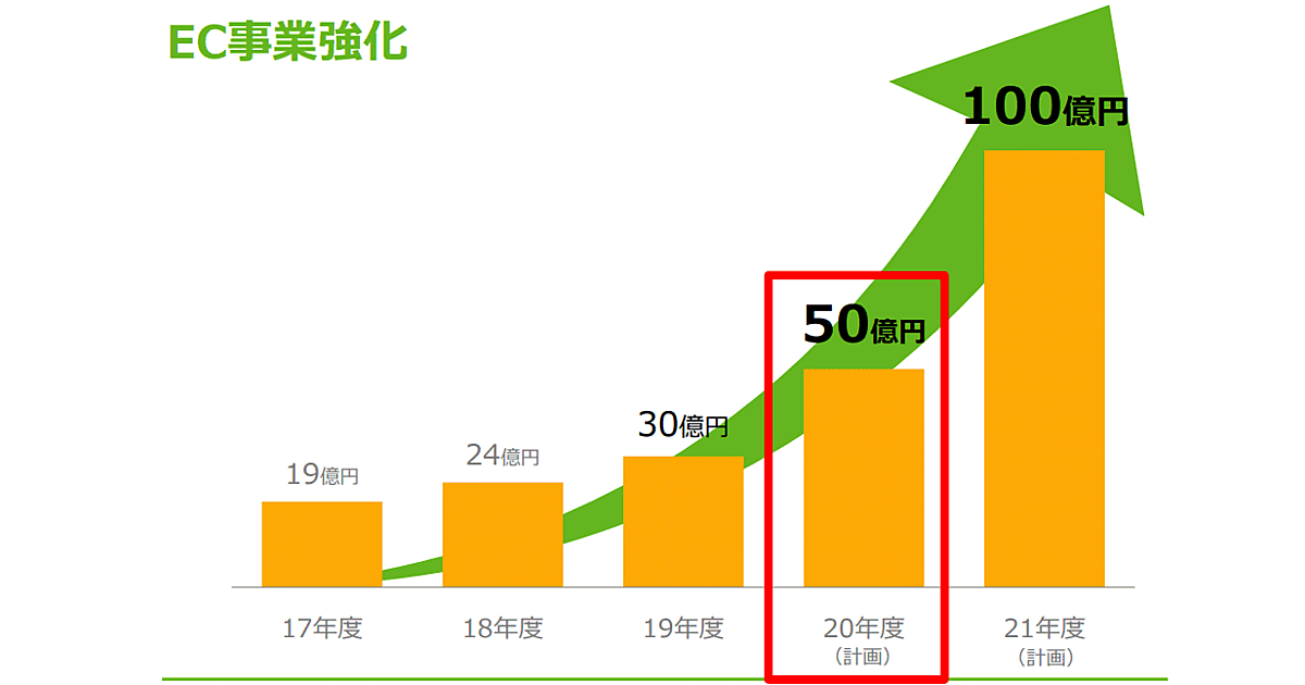 2020年2月期に30億円だったEC売上高を、2021年2月期には前期比66.7%増の50億円まで引き上げる。2022年2月期は100億円まで拡大する計画だ。
