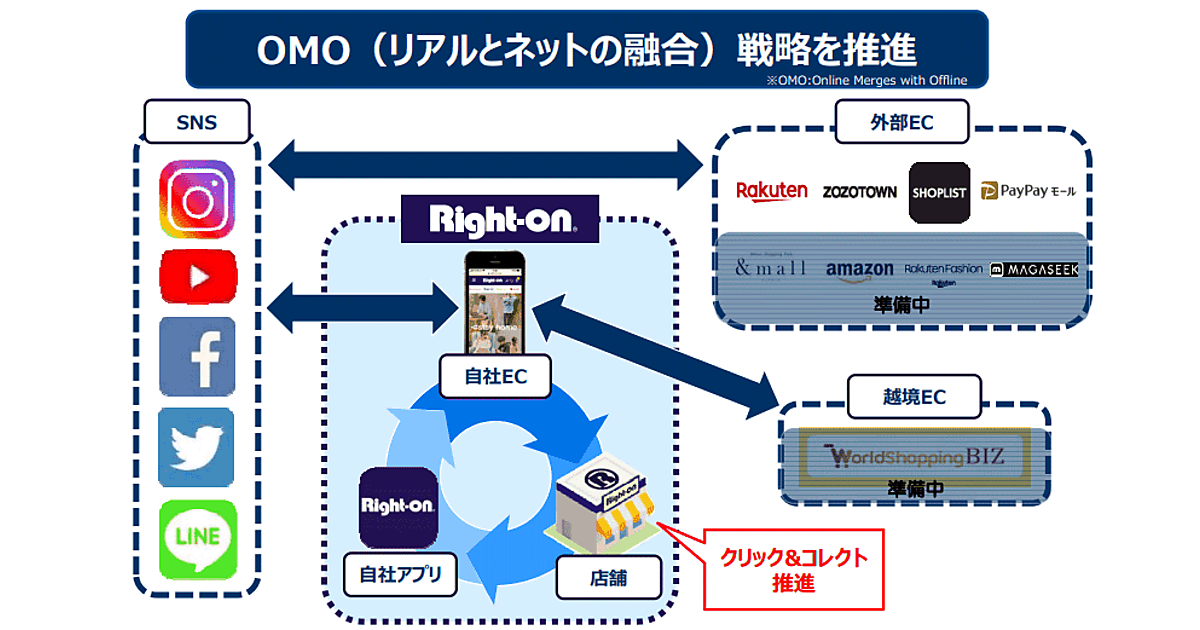 ライトオンはリアルとネットを融合するOMO推進しており、顧客接点の拡充や買いやすさといった利便性向上を実現。その施策として、全国の店舗網を生かしたクリック&コレクトの推進、スマホアプリの会員拡大とファン化の推進、顧客接点拡大に向けたSNS情報の発信強化に取り組む。