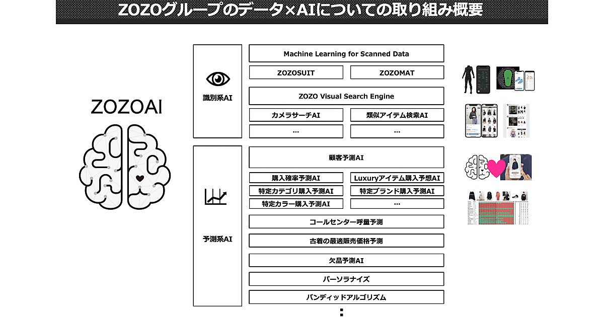 「ゾゾタウン」の年間購入者は860万人超、取り扱いブランドは約8000で、商品情報や購買履歴、閲覧履歴、顧客情報などのデータを持つほか、「ウェア」には着こなしデータを含めトレンドを判断する材料も大量にある。加えてゾゾスーツやゾゾマットで得た体型データもあり、これらのデータを使って売上高拡大や顧客体験価値の向上につながるAI活用を進める。