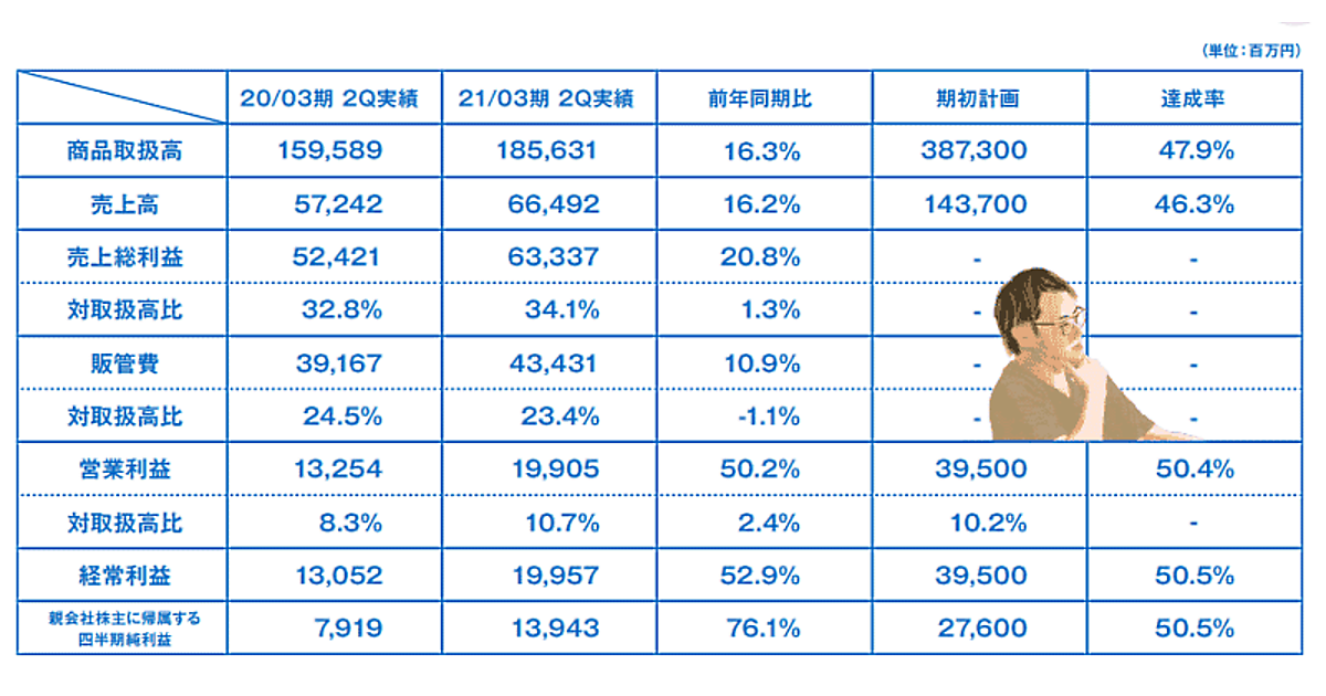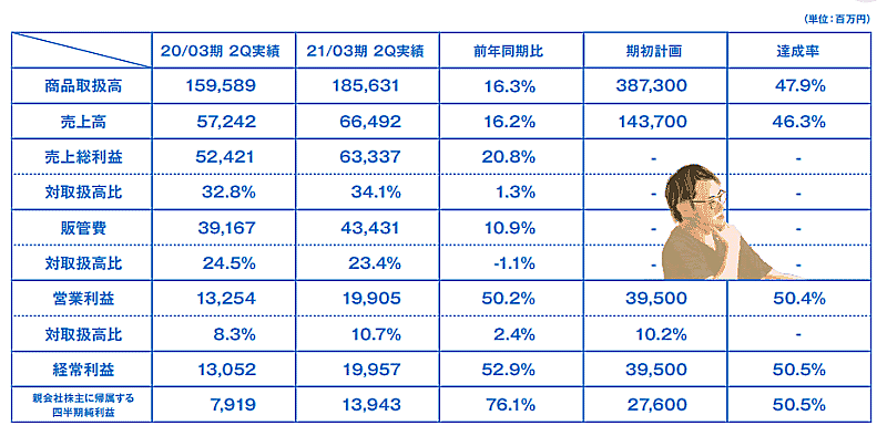 2021年3月期の連結業績は、商品取扱高が前期比12.2%増の3873億円、売上高は同14.5%増の1437億円、営業利益は同41.6%増の395億円、経常利益は同42.9%増の395億円、当期純利益は同46.8%増の276億円を予想している。