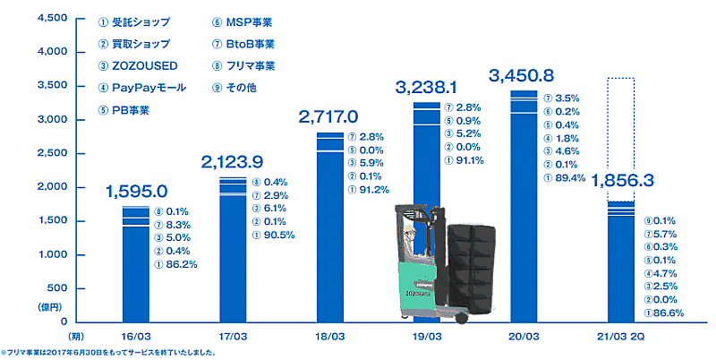 商品取扱高の事業別内訳を見ると、ZOZOTOWN事業が同7.1%増の1654億1100万円、PayPayモールは87億4400万円、PB事業は同73.6%減の1億8400万円、MSP事業は5億6000万円、BtoB事業は同140.9%増の106億2500万円、その他が1億500万円。