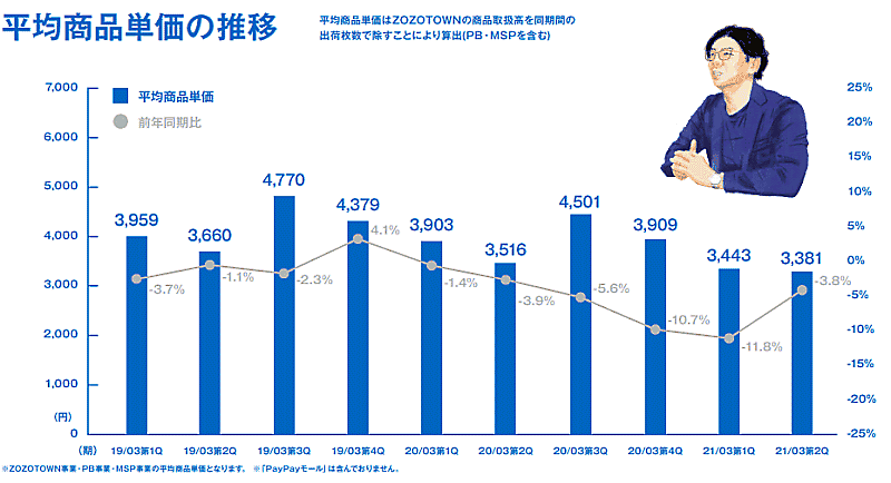 平均商品単価は今期、3000円台で推移、中間期は前年同期比3.8%減の3381円。
