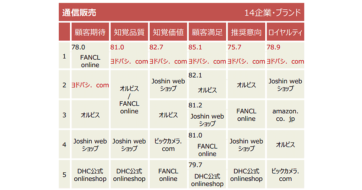 顧客満足度のトップは「ヨドバシ.com」、2位は「オルビス」、3位は「Joshin webショップ」。4位は「FANCL online」、5位は「DHC公式onlineshop」。