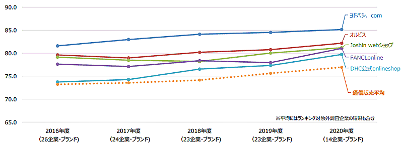 「ヨドバシ.com」は2016年度以降、4年連続でスコアが上昇。「オルビス」は2017年度から2020年度にかけてスコアが上昇した。「Joshin webショップ」は2018年度から2020年度にかけてスコアが上昇している。