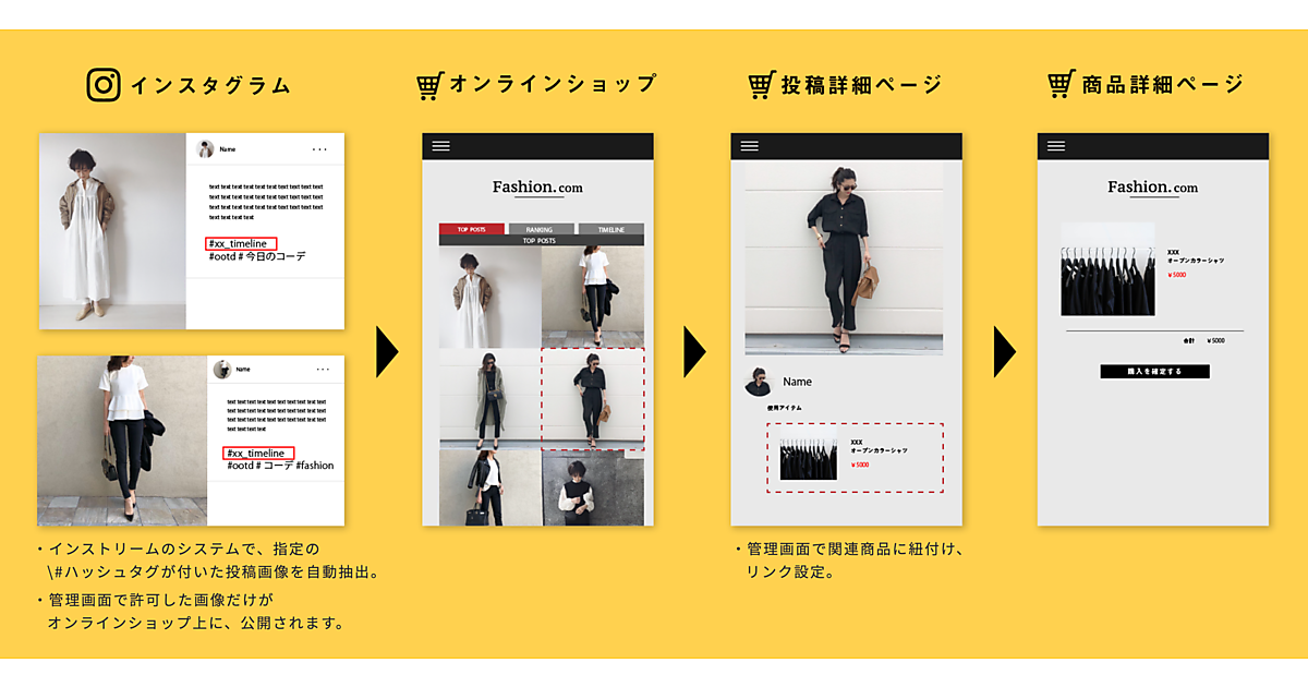 ファッションECサイトの「fifth」などが利用する「imstream」は、インスタグラムに独自のハッシュタグを付けて投稿すると、投稿画像を抽出しECサイトに商品を紐づけて掲載するというもの。