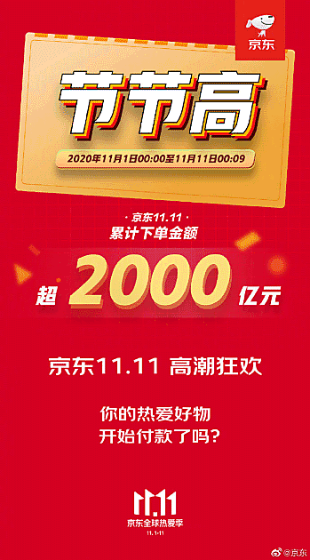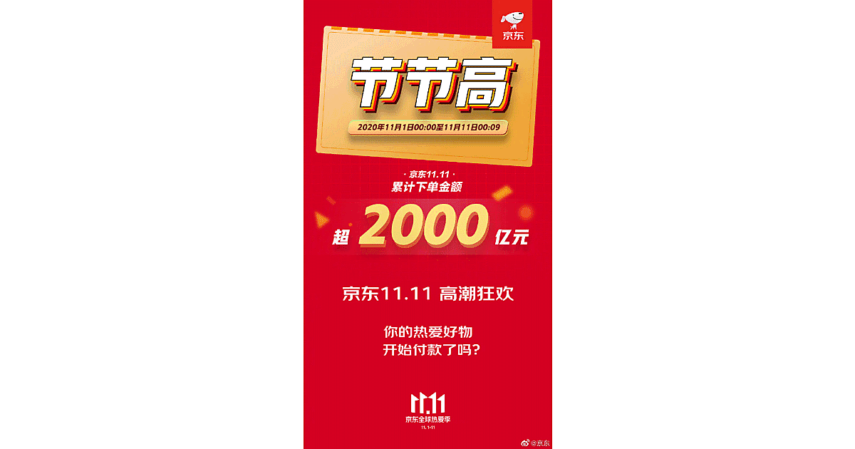 中国でスタートしたネット通販の買い物の祭典「独身の日」(W11、ダブルイレブン)キャンペーンで、「JD.com」運営の直販EC最大手「JD.com」を運営する京東集団の取扱高(GMV)は、11月1日から11月11日午前0時9分までで2000億人民元となった。