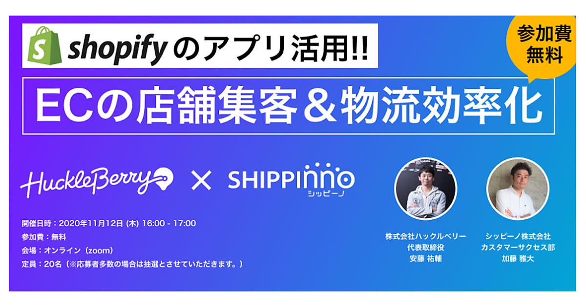 ハックルベリーは、「Shopifyのアプリ活用!! ECの店舗集客&物流効率化」と題したセミナーを2020年11月12日(木)16時からオンライン形式で開催する。