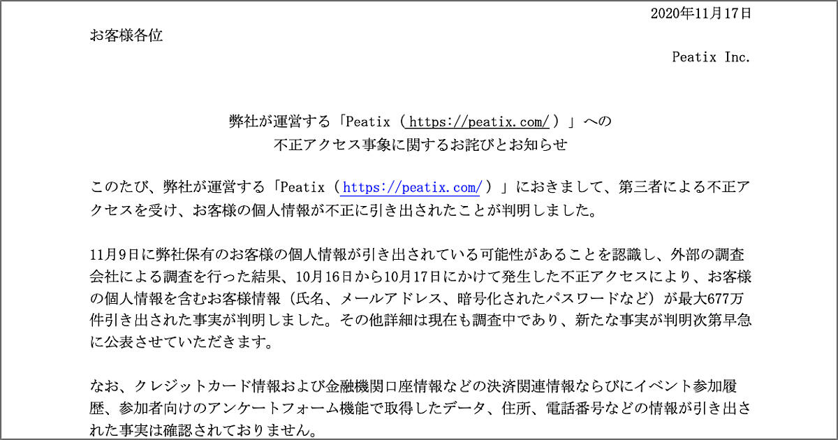 イベント管理サービスの「Peatix(ピーティックス)」は11月17日、第三者による不正アクセスを受けて、顧客情報の一部が最大で677万件が引き出されたと発表しました。