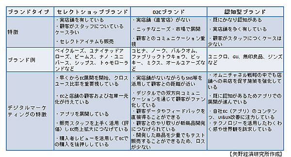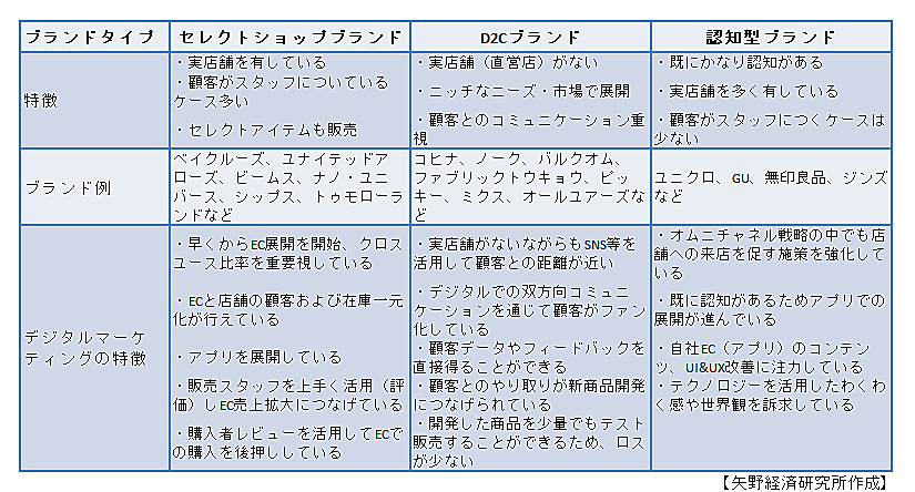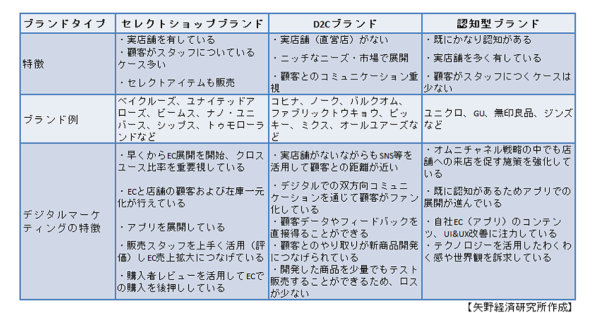矢野経済研究所は、「セレクトショップブランド」「D2Cブランド」「認知型ブランド」というブランドタイプに分類。デジタルマーケティング戦略を比較した。