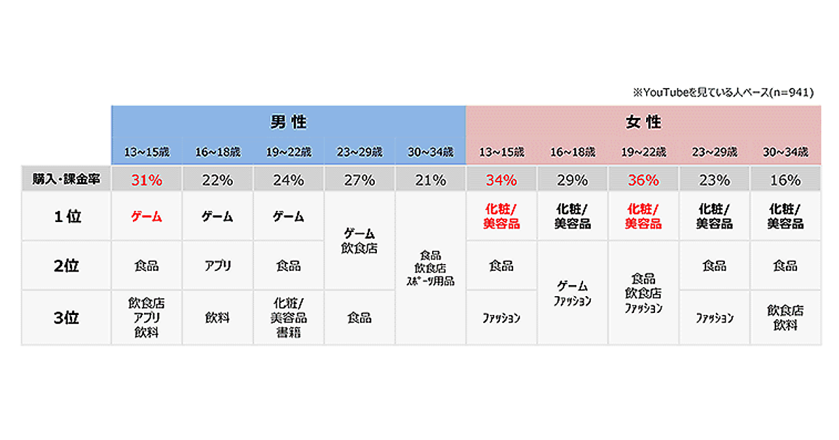 13~15歳男性の購入・課金率は31%で1位はゲーム。女性の購入・課金率で最も多かった年齢層は19~22歳で、購入・課金率は36%、購入商品のトップは化粧・美容品だった。13~15歳女性の購入商品トップも化粧/美容品で、購入・課金率は34%となっている。