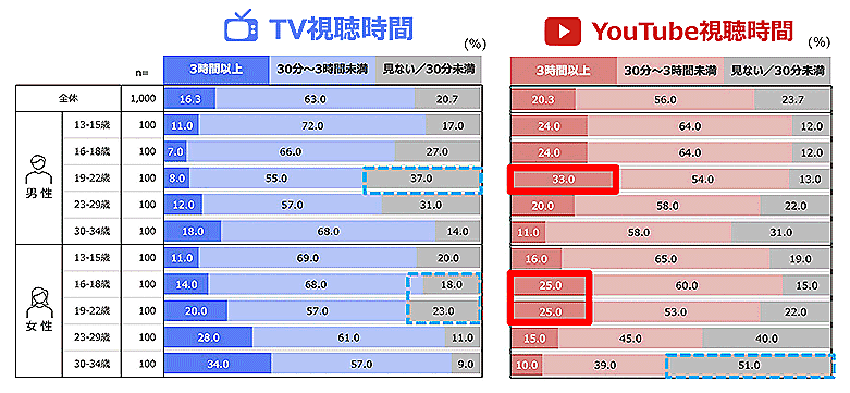 1日あたりのTV視聴時間、YouTube視聴時間を調査したところ、YouTubeの視聴時間が最も多かったのは19~22歳(主に大学生)の男性で33%。女性も16~22歳(主に女子高生・女子大生)で、YouTube視聴時間が長く、16~18歳と19~22歳が各25%となっている。