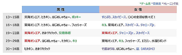 男性では「ポッキー・兄者弟者・キヨ」などのゲーム系チャンネル、女性では「すとぷり・スカイピース・嵐・ジャニーズJr.」といった音楽系、「竹脇まりな」といったトレーニング系などが上位の回答にあがった。