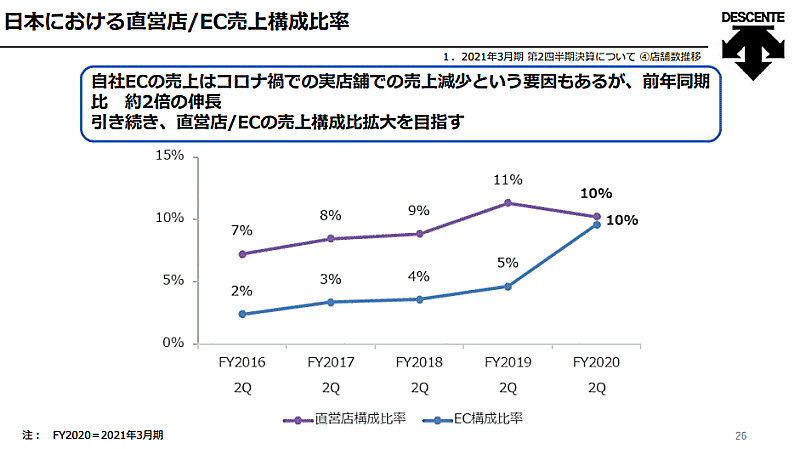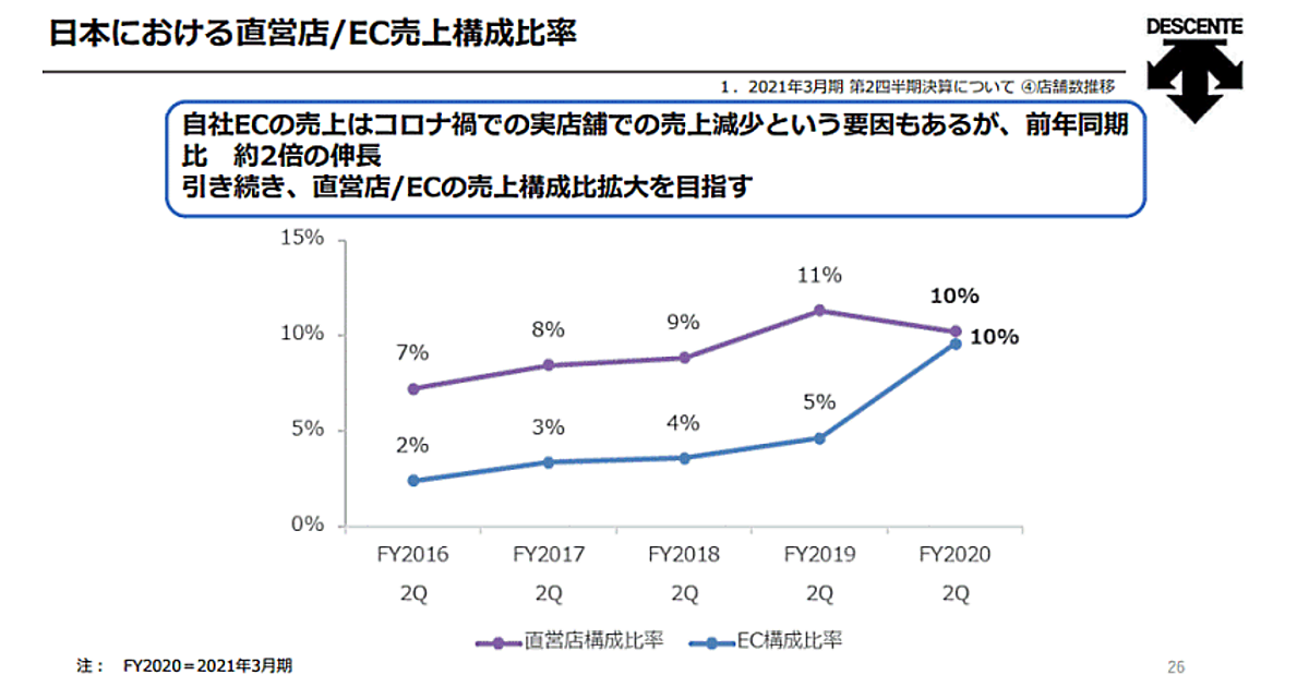 デサントが直営店やネット通販などのD2Cビジネスの強化を進めている。直販を通じた顧客接点の拡大で、現在10%程度のEC化率を将来的には2割まで引き上げる。