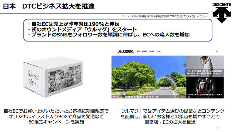 デジタルマーケティングとしては、オウンドメディア「ULLR MAG.(ウルマグ)」」をスタートした。「ウルマグ」はアイテム選びの提案などコンテンツを配信。ブランドのSNSもフォロワー数を順調に伸ばし、ECサイトへの流入数も増加しているという。