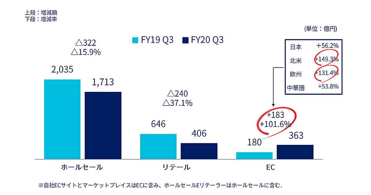 2020年1~9月期(2020年第3四半期累計)におけるEC売上高は、前年同期比101.6%増の363億円だった。EC売上高は日本、北米、欧州、中華圏といったグローバルでの合算数値。