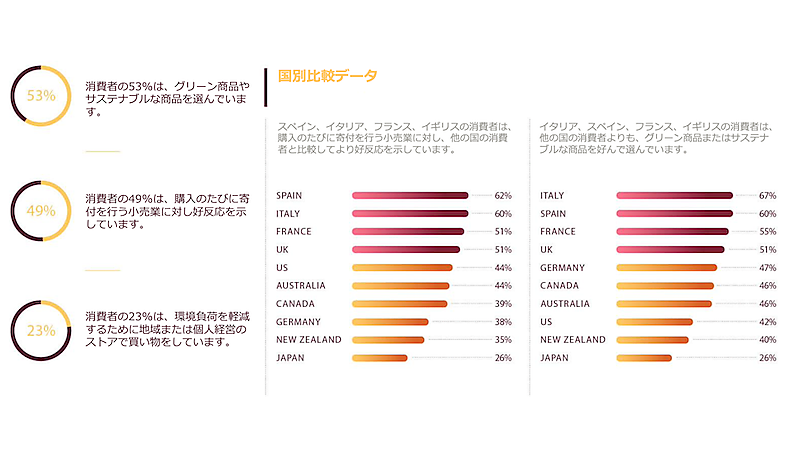 - 消費者の23%は、環境負荷を軽減するために地域または個人経営のストアで買い物をしている