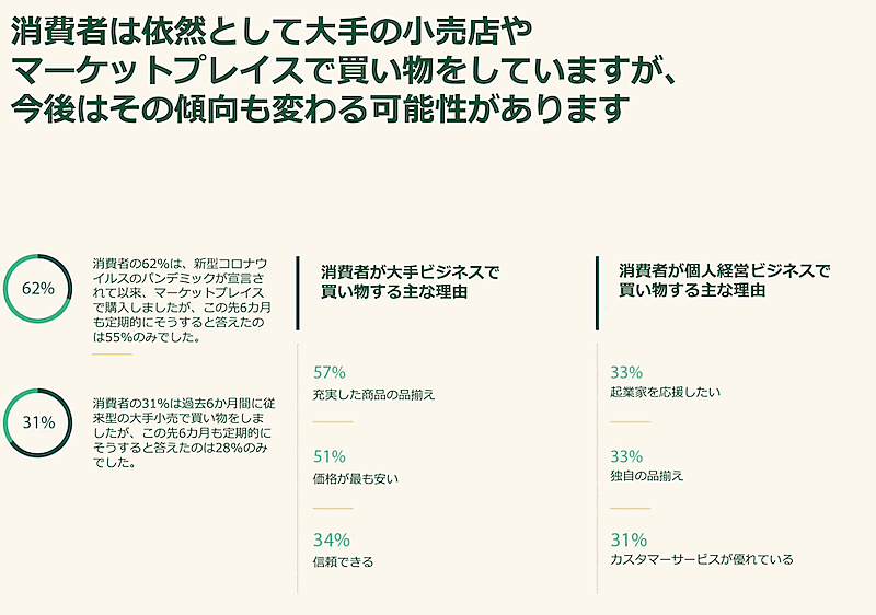 消費者の50%は「個人経営のビジネスを支援したい」と考え、65%は「スモールビジネスを支援したい」と回答。57%は「新しく見つけたブランドやストアで買い物してみたい」と答えるなど、世界的に「個人経営ストアで買いたい」ニーズが高まっている。