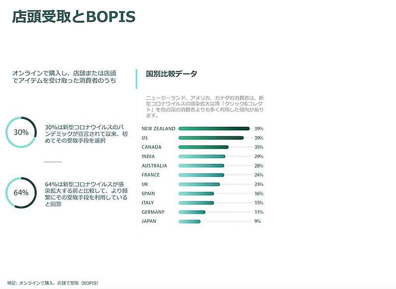 注目したいのは、新たな受け取り方法と配送方法を提供するストアの売上状況。2020年5月から8月までの期間、オンラインで買い物した人のうち、店舗受取(BOPIS)またはローカルデリバリーを選択した人の平均値は次の通り。