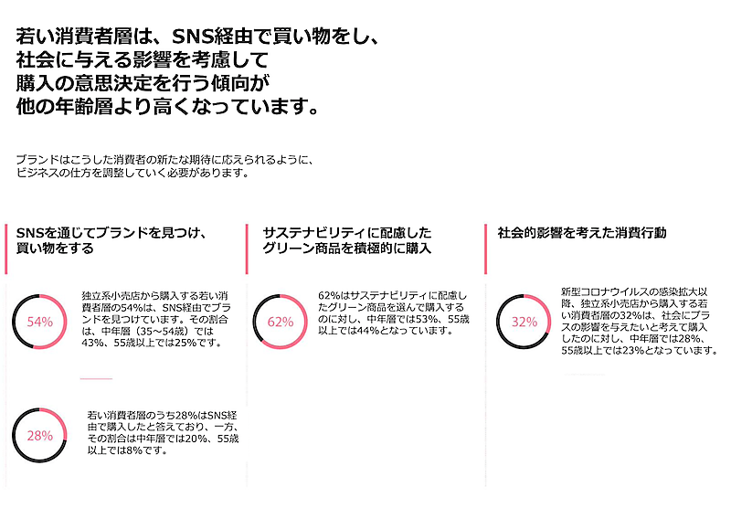 新型コロナウイルス感染症の世界的流行で、消費行動はEコマースにシフトしました。若い消費者層が今後もこの動きを加速させるでしょう。ブランドは自社のオムニチャネル戦略を強化し、SNSの活用に投資、ブランドの信頼性や持続性を証明しなければなりません。(年次レポートより)