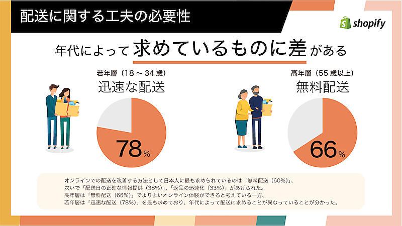 - オンライン買い物客のうち59%は、無料配送であればオンラインショッピング体験がよりよいものになると回答