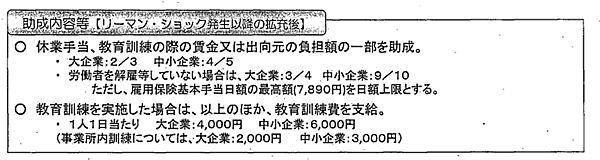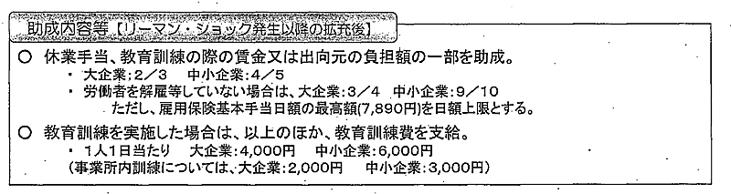 リーマンショック発生以降、助成率は中小企業が80%(4/5)で大企業は約67%(2/3)。労働者の解雇などをしていない場合の助成率は一律10/10、大企業は3/4だが、雇用保険基本手当の日額は7890円が日額上限となっていた。