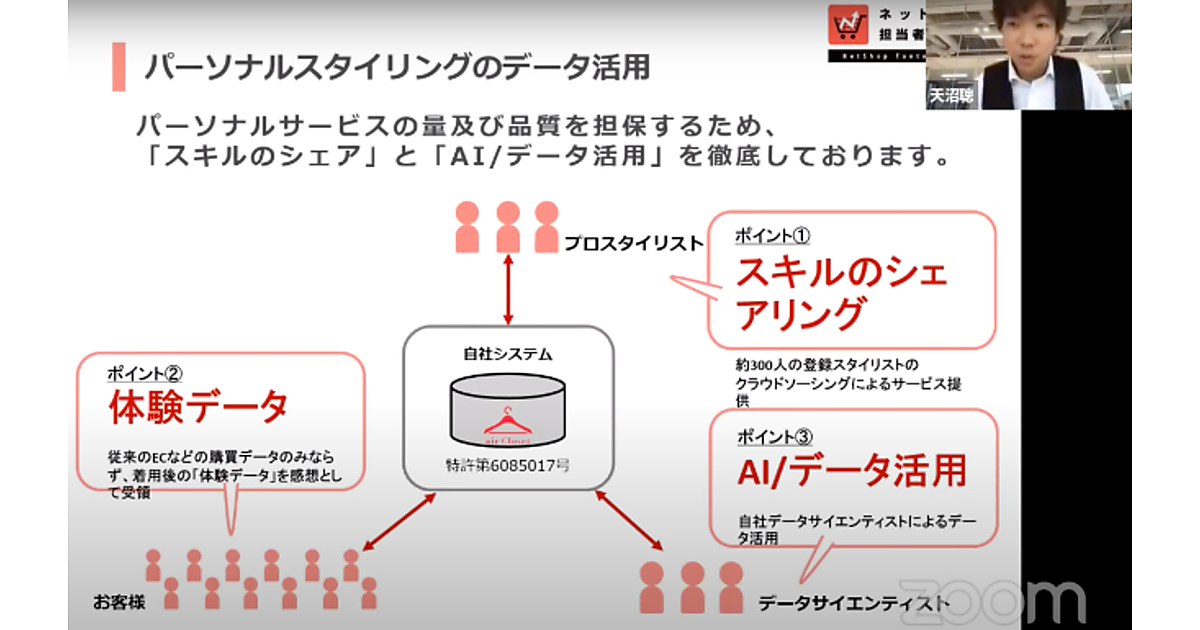 購買データだったり、どのお客さまにどのお洋服が貸し出されたかのひもづけやレンタル履歴だったり、そういったデータを取得し、(それを活用するための)システム設計を進めてきた。(天沼氏)