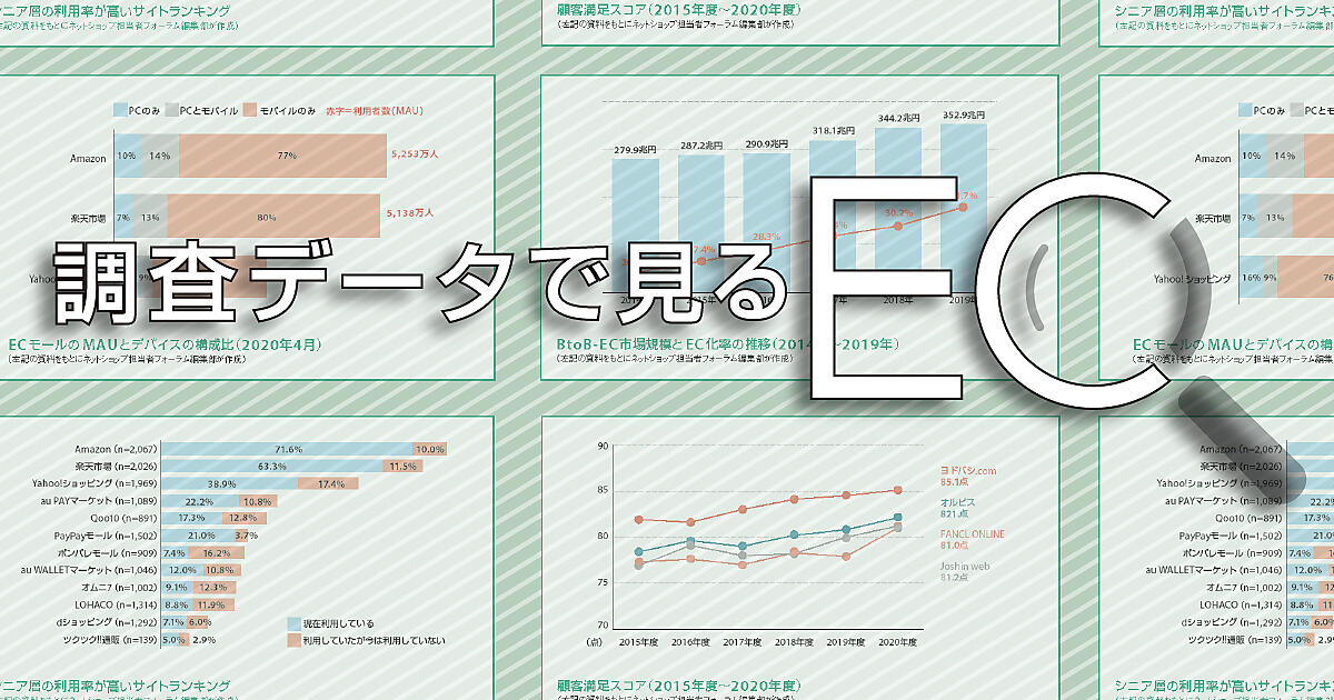 経済産業省の「令和元年度 内外一体の経済成長戦略構築にかかる国際経済調査事業(電子商取引に関する市場調査)」をはじめ、各省庁や日本通信販売協会、調査会社各社が発表したデータを、同じフォーマットで見やすくまとめました。ECを取り巻く環境を知るための資料として、企画書やプレゼンにご利用ください(第三者への配布や商用利用はご遠慮ください)。