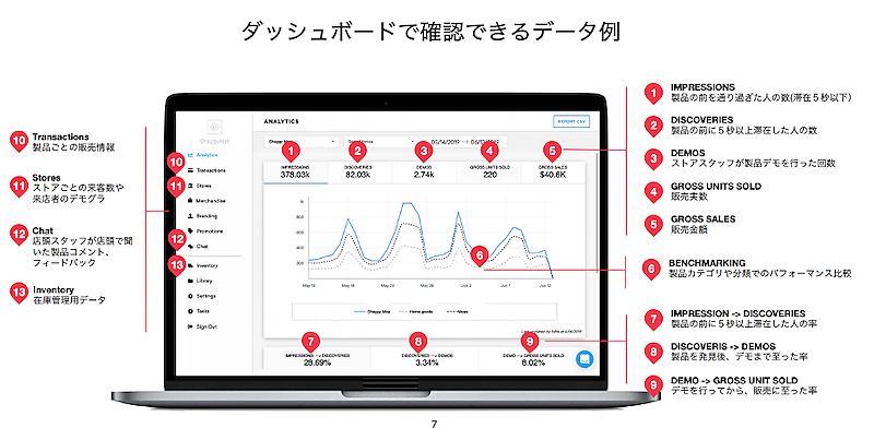 出品企業は、ダッシュボードから消費者のさまざまなマーケティングデータを閲覧することが可能。そのデータは、出品商品の入れ替え(最低契約期間6か月の場合は、最大3回まで入れ替え可能)、商品横に置いたタブレット内の商品紹介ページに手を加えたりといった「マーケティングデータ」として役立てている。