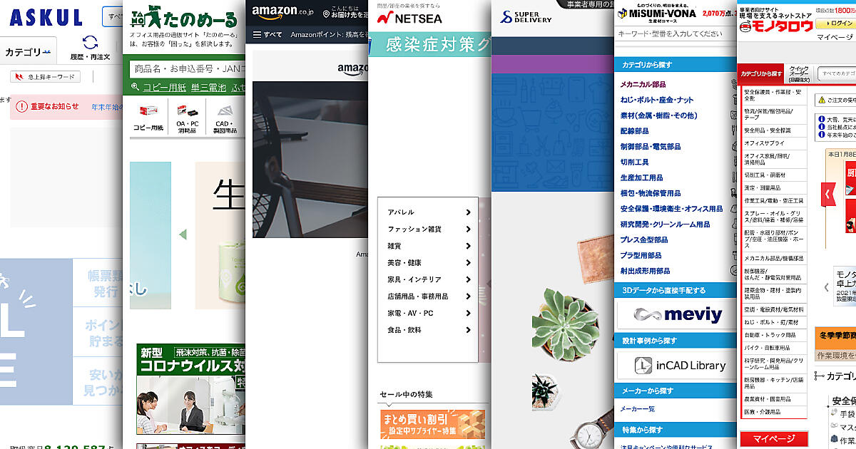 購入側の法人・事業主が製品をそのまま消費することを想定して運営されているECサイトや、工場などで使われる間接資材などを販売するECサイト。オフィス用品通販の「ASKUL」(運営:アスクル)「たのめーる」(運営:大塚商会)、工具・現場金物通販の「モノタロウ」(運営:MonotaRO)、精密機械部品を販売する「MISUMI-VONA」(運営:ミスミグループ)などが代表的である。