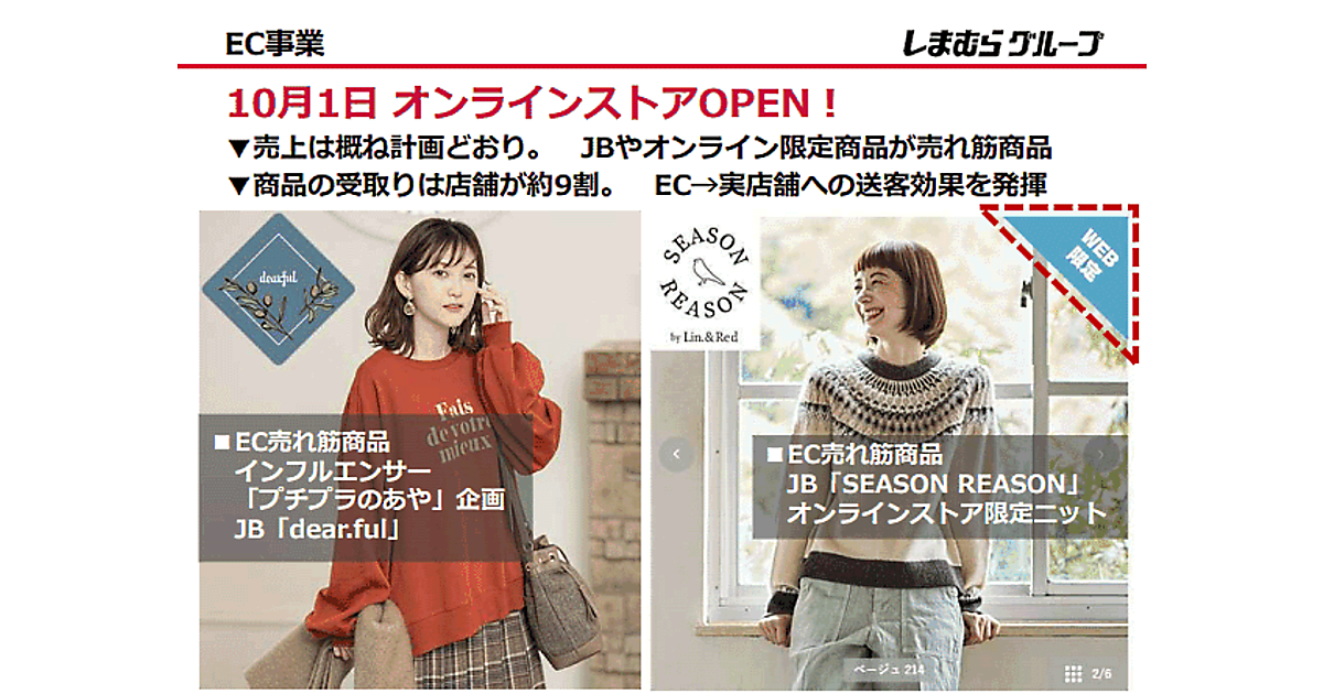 売れ筋商品は、インフルエンサー企画であるサプライヤーとの共同開発ブランド「JB(Joint Development Brand)」、キャラクター商品、オンライン限定商品などとなっている。傾向はオンラインストアの前身である「しまコレ」と同じという。「しまコレ」の顧客が、ECサイトへスムーズに移行していると見ている。