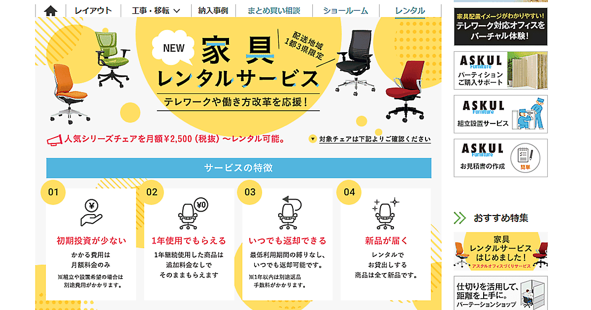 まず1都3県(東京、神奈川、千葉、埼玉)を対象に、オフィスチェア35商品から開始する。
