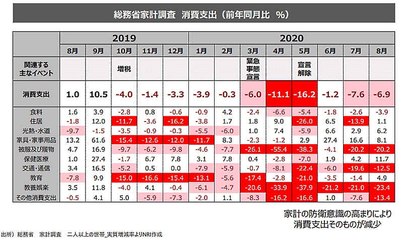 総務省の家計調査によると、2人以上の世帯の消費支出は前年同月比で、4月度は11.1%のマイナス、5月度は16.2%のマイナスとなった。外出控えの反動で6月度の消費支出は大幅に改善されたが、その後の消費の回復は鈍い。
