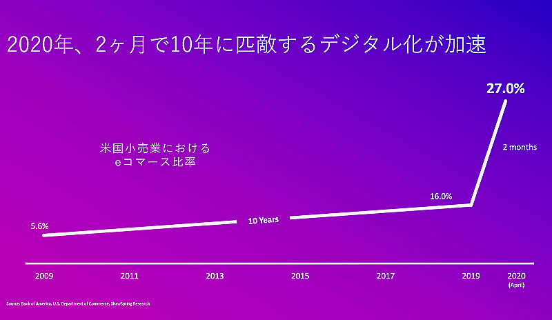 米国では2020年、新型コロナウイルス感染症拡大により、2か月間で米国小売業におけるEコマース比率が27.0%に拡大。「これまでの10年に匹敵するぐらい、一気にデジタル化が進んだ」(丸山氏)