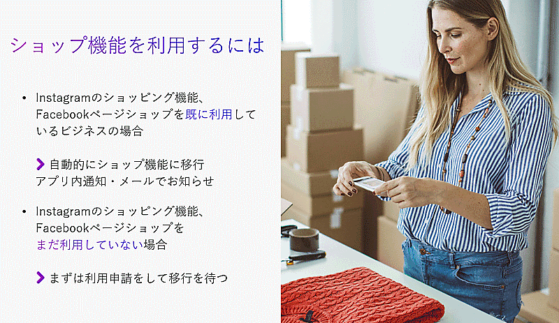 ただ、Facebookページショップ、Instagramショッピング機能を利用していない場合は、申請利用を行ってから移行を待ってほしいとしている。