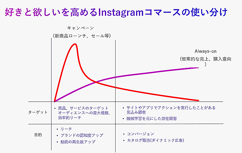 Eコマース事業者が広告を出稿する場合、新商品ローンチやセール期間など、一定期間のキャンペーンを通じてリーチやブランド認知を目的としたもの、もしくは売り上げや購入意欲の醸成を狙うために恒常的に広告を掲載する場合に大別される。丸山氏は、これら異なる目的の広告を使い分けることが重要だと強調する。