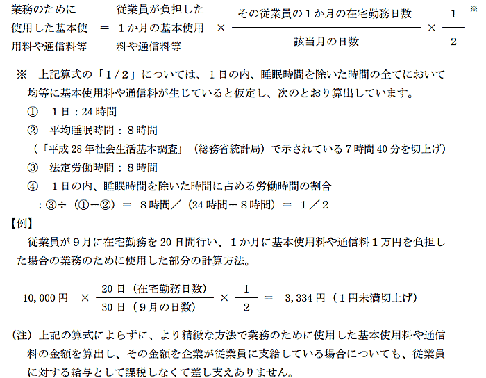 業務目的の通話料(基本使用料を除く)については非課税。業務のための通話を頻繁に行う従業員の基本料金、また、インターネット接続に関する通信料については、以下の算式((基本料金や通信料など)×(1か月の在宅勤務日数)/(該当月の日数)×1/2)によって算出した金額を非課税とする。