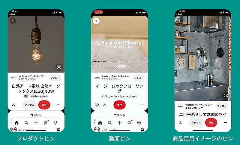 「toolbox」では、「プロダクトピン」のほか、「動画ピン」を活用している。「プロダクトピン」は価格のほか、在庫の有無も表示。「ECサイトを運営している企業にとってはこの機能が最も適している」(梅川氏)