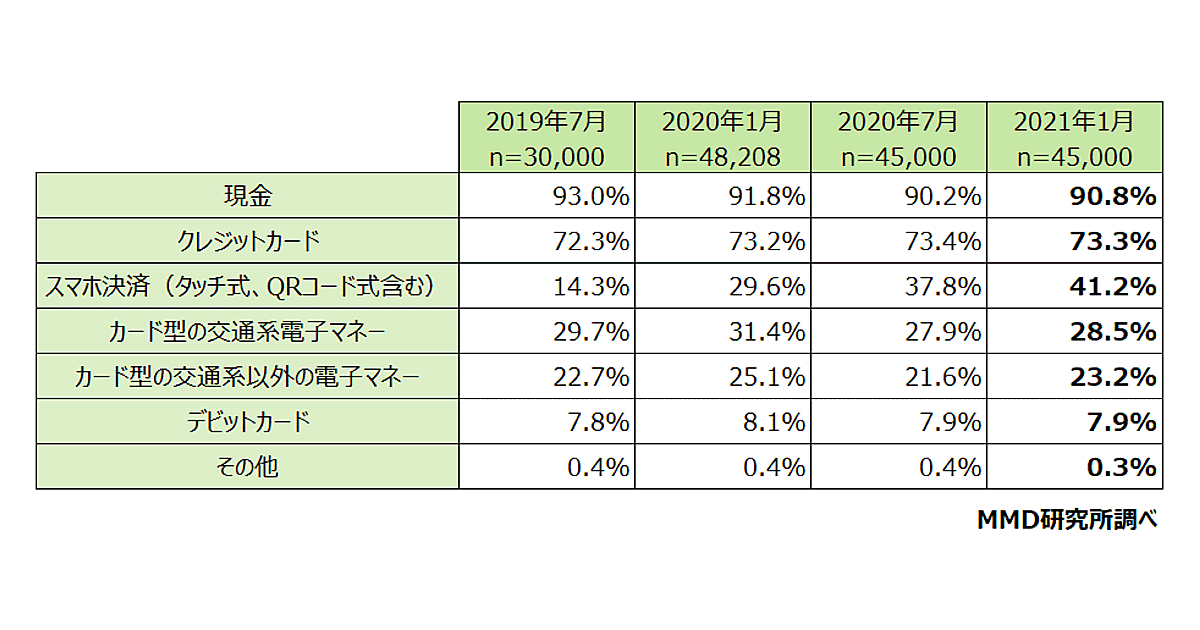 MMDLaboが運営するMMD研究所が発表した「2021年1月スマートフォン決済(QRコード)利用動向調査」によると、普段の支払い方法において「スマートフォン決済」は3番目に多く、2020年7月の調査結果と比べて、他の支払い方法より増加率が高かった。調査対象は18歳~69歳の男女4万5000人。期間は2021年1月1日~1月4日。
