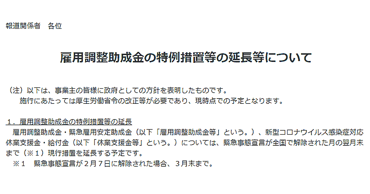 緊急事態宣言が2月7日に解除された場合、対象期間は3月末までとなる。対象は、「雇用調整助成金」「緊急雇用安定助成金」「新型コロナウイルス感染症対応休業支援金・給付金」