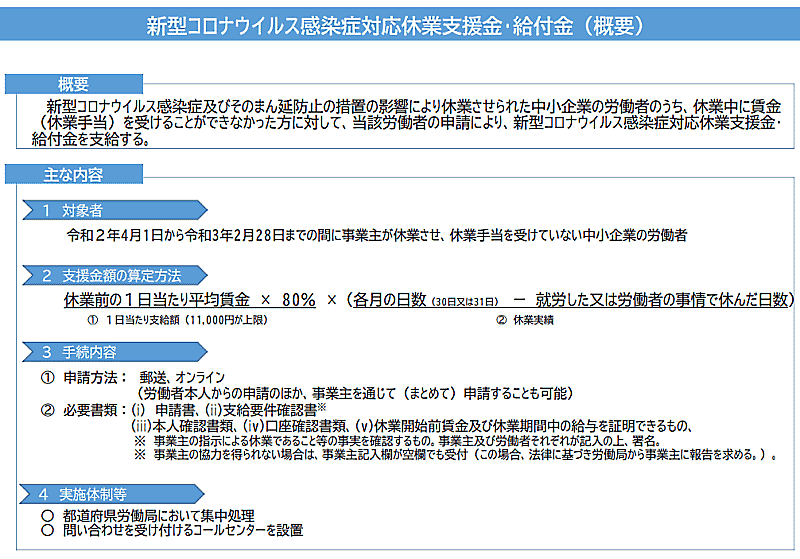 新型コロナウイルス感染症の影響で勤務先から休業させられたものの、勤め先から休業手当を受け取れないといった労働者が直接、生活資金を申請できるようにする労働者向けの給付制度。