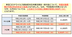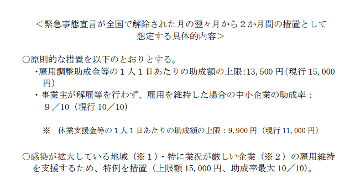 雇用情勢が大きく悪化しなことを前提に、緊急事態宣言が全国で解除された月の翌々月から縮減。2か月間の措置として、「雇用調整助成金」(特例措置)の現行措置で1人1日あたりの助成額1万5000円(上限)は、1万3500円まで上限を減らす。