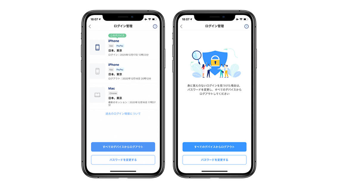 PayPayは、キャッシュレス決済サービス「PayPay」を利用している端末を一覧で管理できる「ログイン管理」機能を1月26日から開始した。複数端末で同一の「PayPay」アカウントを利用する際、どの端末からログイン・利用しているかを一覧で確認できる。また、手元の端末ですべての端末からログアウトすることも可能。