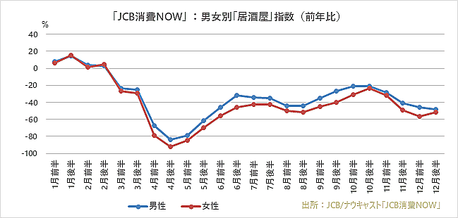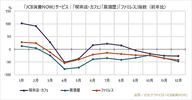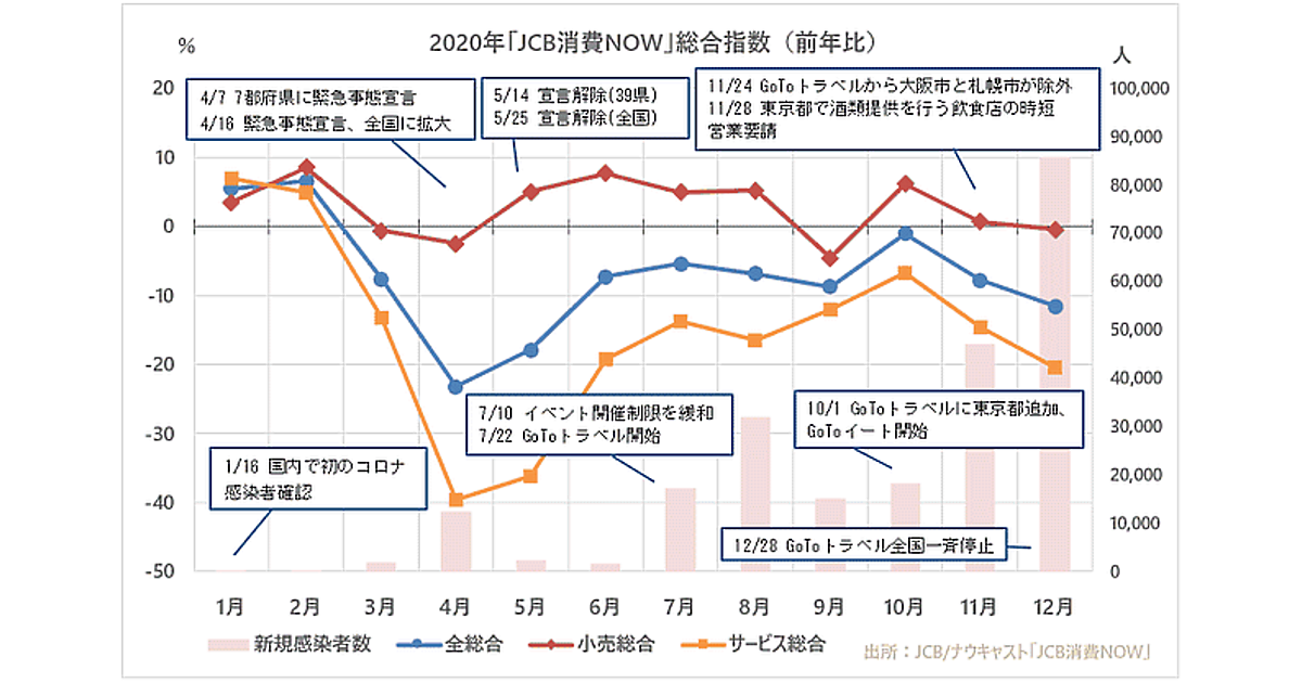 ジェーシービー(JCB)とナウキャストは1月27日、JCBカードの取引データを活用した国内消費指数「JCB消費NOW」を用いて、2020年1月から12月までの消費動向の総括を発表した。