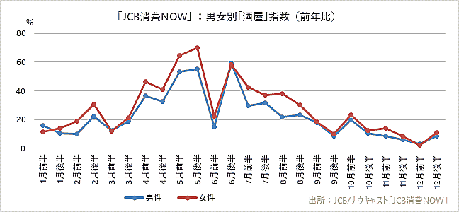 女性は宅飲み傾向が高い。外出を伴う「居酒屋」は、男性に比べて女性の消費の伸び率が低い。一方「酒屋」は、1月後半以降ほぼ一貫して女性の消費伸び率が男性を上回っており、女性の方が宅飲み傾向が高いことがうかがえる。