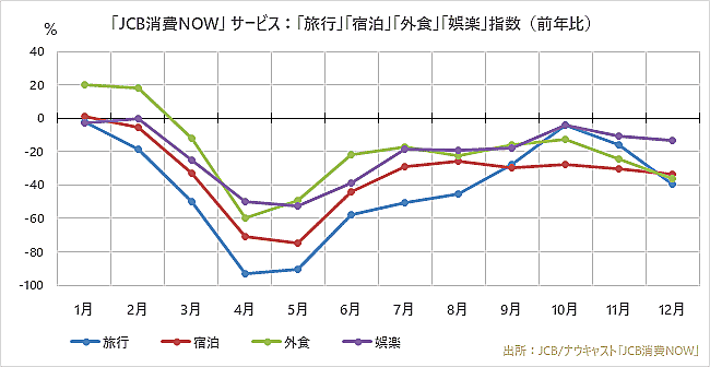 「旅行」は4月と5月にそれぞれ前年同月比93.1%減と90.3%減を記録。その後は回復基調にあったが、11月からの「第3波」を受けて減速した。