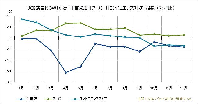 「百貨店」は「第1波」時の落ち込みからは回復しているものの、マイナス圏内で足踏みが続く。「スーパー」は年間を通して堅調に推移した。「コンビニエンスストア」は、9月までは前年同月比でプラスを維持していたが、10月にマイナスに転じた。