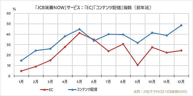 「EC」と「コンテンツ配信」は「第1波」以降、「第3波」下でも好調を維持している。特に「コンテンツ配信」は5月以上に大きく伸長し、12月に前年同月比48.6%増を記録した。