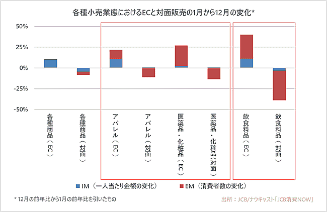 各種小売業態においてECが拡大した。「アパレル」「医療品・化粧品」は、対面消費の減少分を上回る伸びをEC売上で記録。「飲食料品」は対面売上の減少分をECでカバーした。